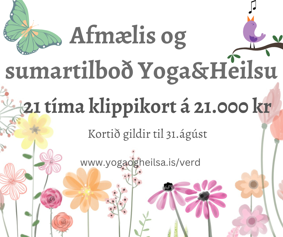 Við ætlum að bjóða þér sérstakt klippikort á sumar og afmælistilboði, 21 tími í yoga á 21.000 kr (kortið gildir til 31.ágúst). Við höfum fulla trú á því að með því að mæta í að minnsta kosti 21 yogatíma í sumar að þá takist þér að festa yogaiðkunina í rútínuna þína og með því að bæta líkamlega og andlega heilsu.